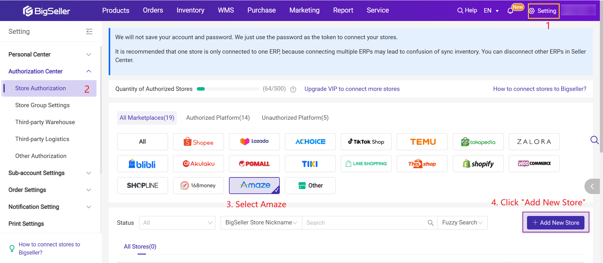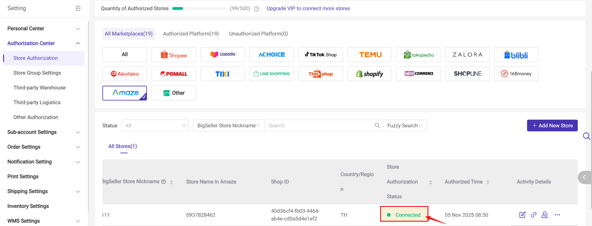 Step 1: Go to the Store Authorization page > Select the Amaze platform > Click "Add New Store".