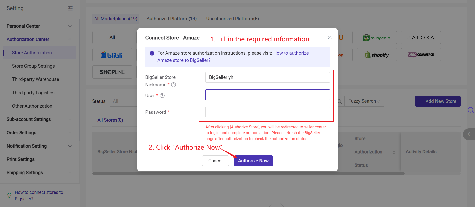 For account and password, you must contact Amaze Customer Service to obtain the account and password required for connecting with BigSeller.