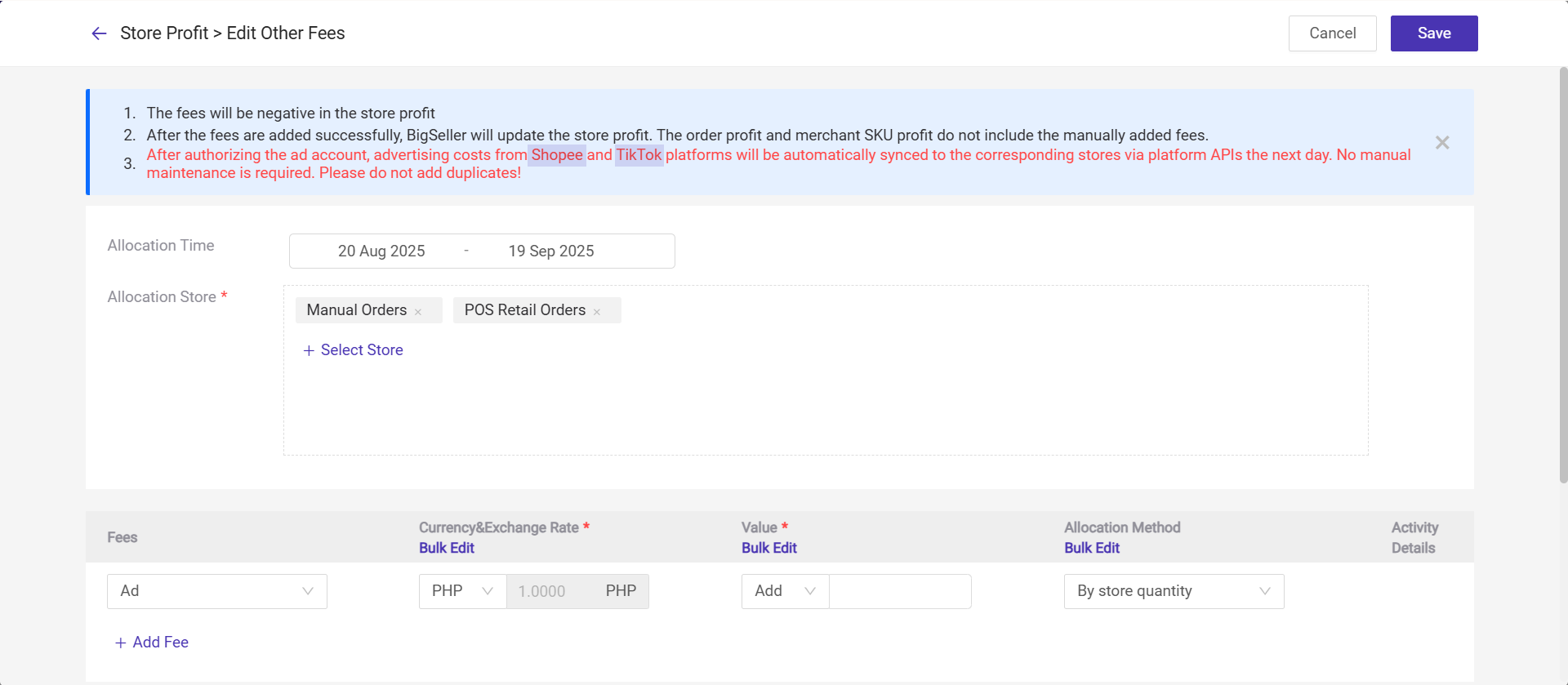 Note: From now, BigSeller will automatically fetch historical ads fee for your Shopee and TikTok stores. To avoid duplication, please do not manually add Shopee ads expenses under Other Fees.