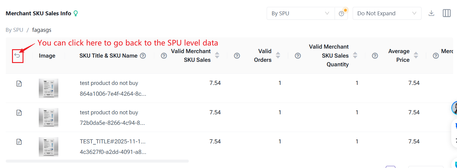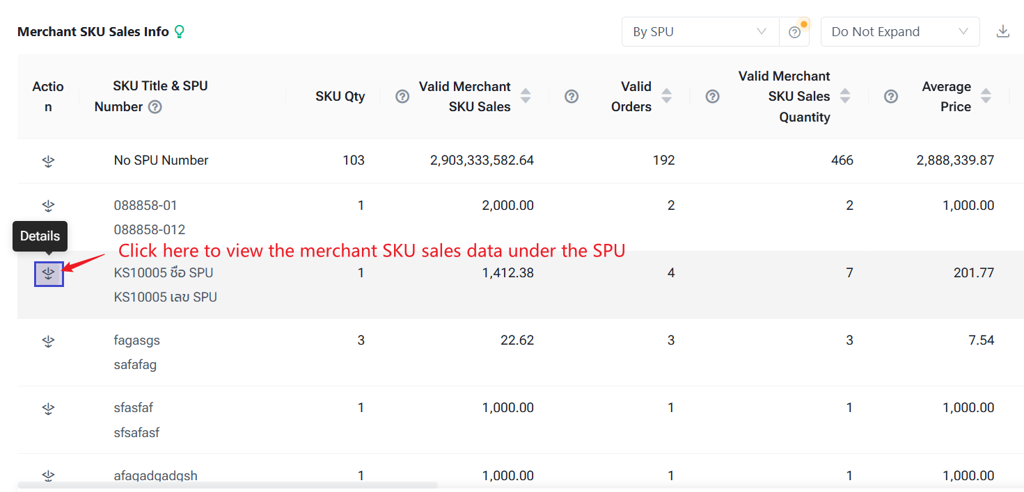 When you choose to aggregate by the SPU dimension, you can click the Detail button to view the sales information of the SKU variants under that product.