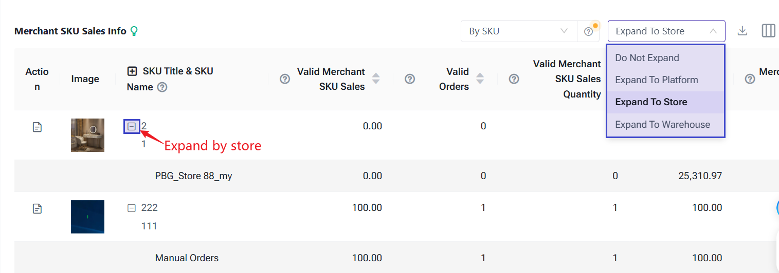 2) if you choose to dispaly data by SPU, you can click drill down to to view or compare the sales performance of individual merchant SKUs under the SPU.