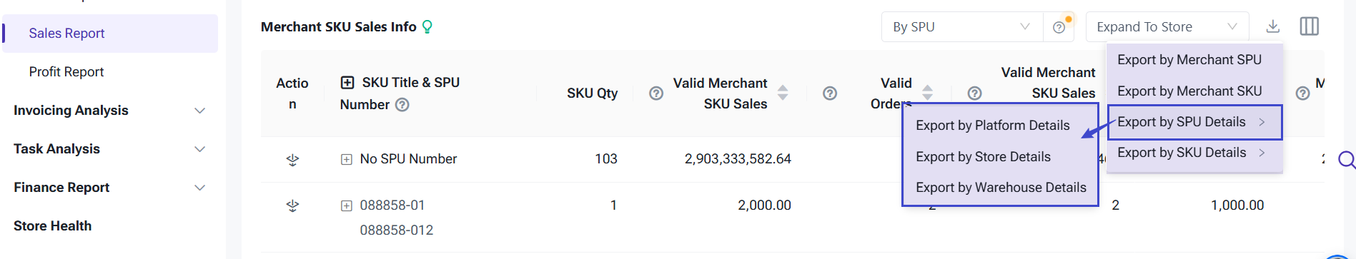 You can also export data using Export by Store SPU, Export by SPU, or Export by SKU + Date.
