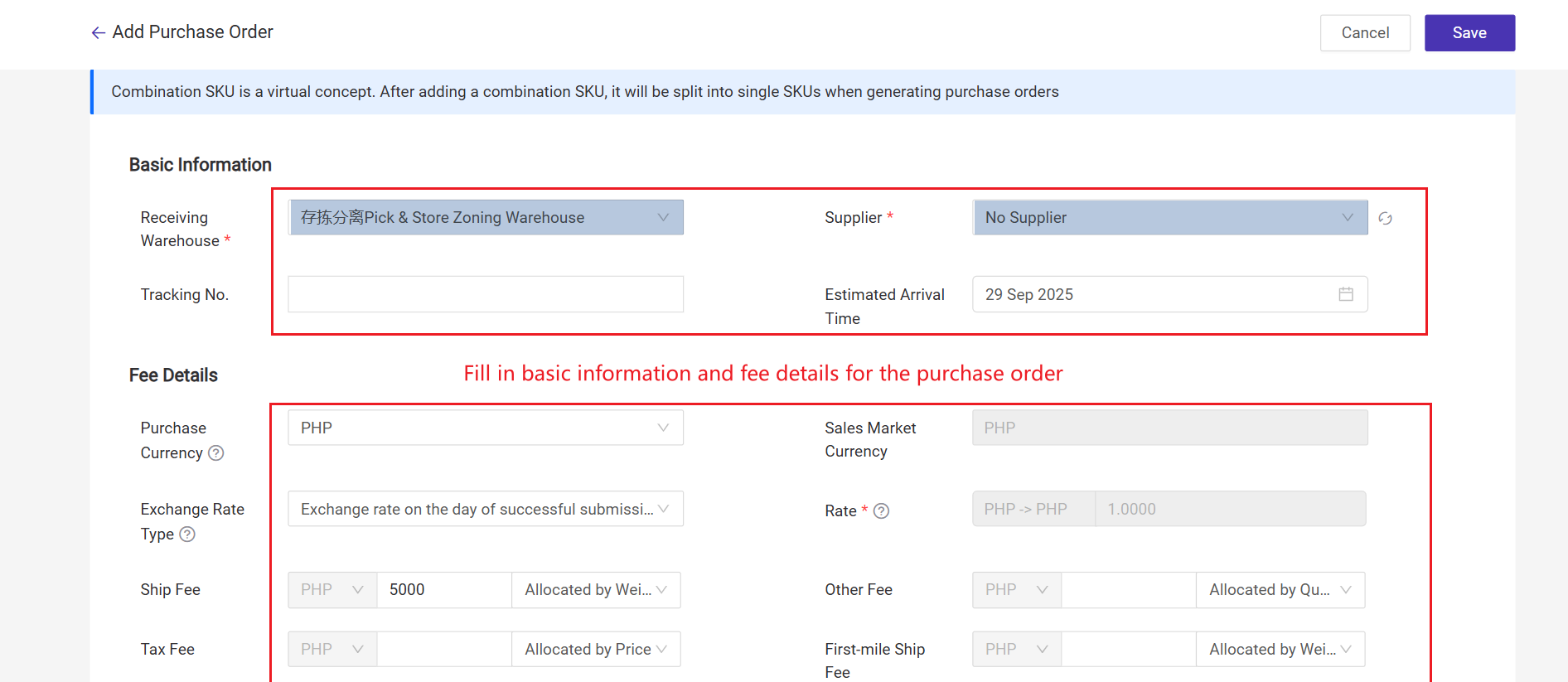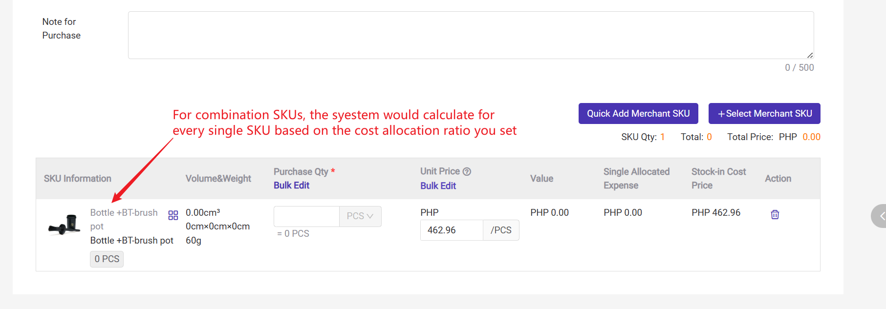 Note: 🔖 If you select a combination SKU, system will split it into single SKUs and calculate the unit price based on the cost allocation ratio you set when you create this combination SKU. For example: