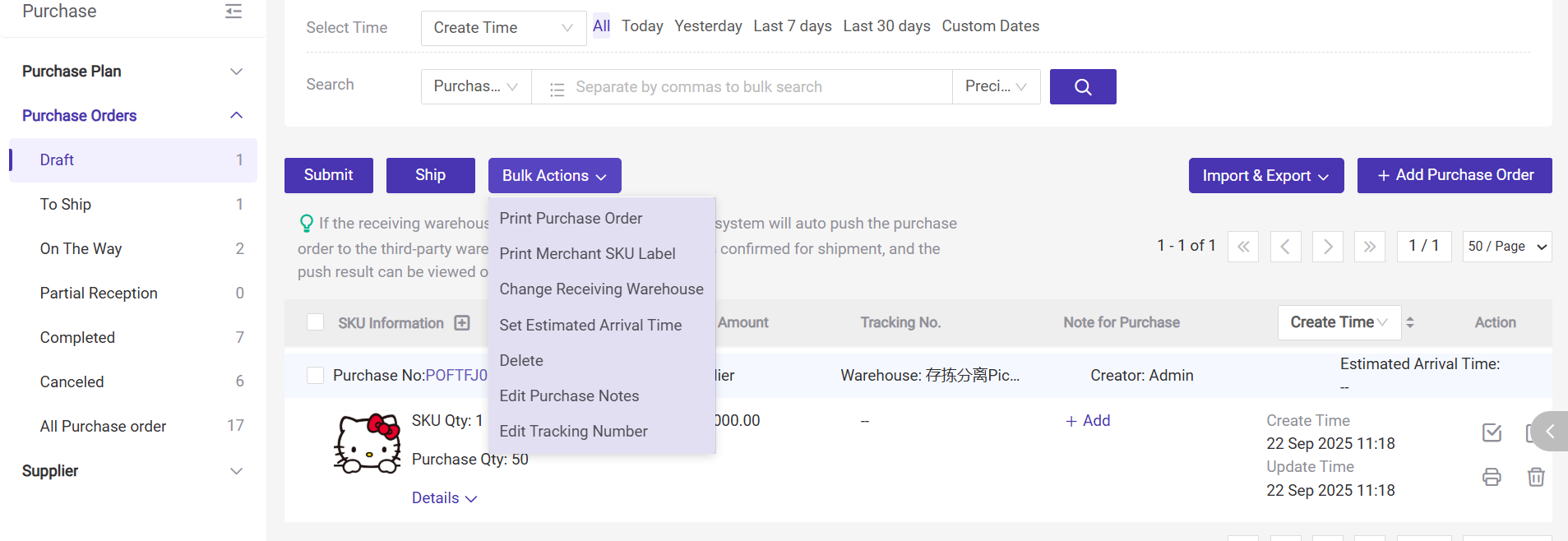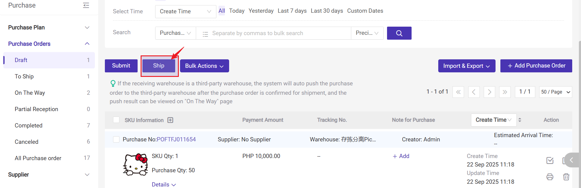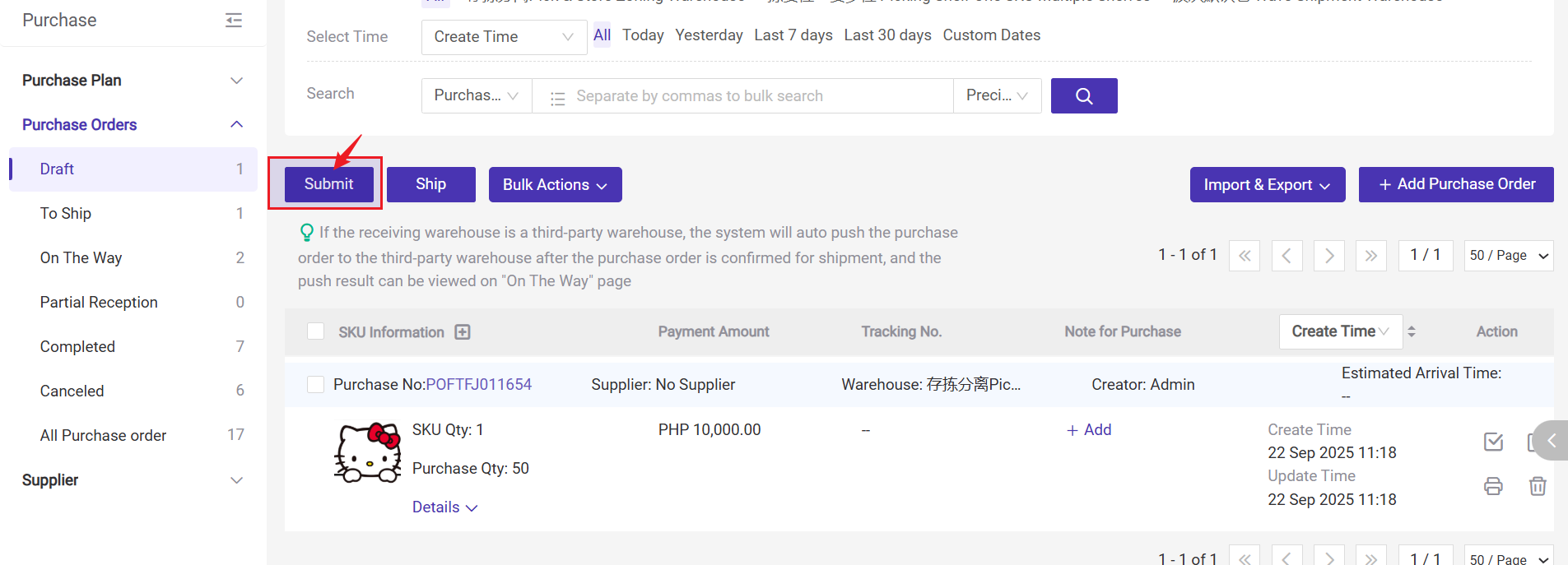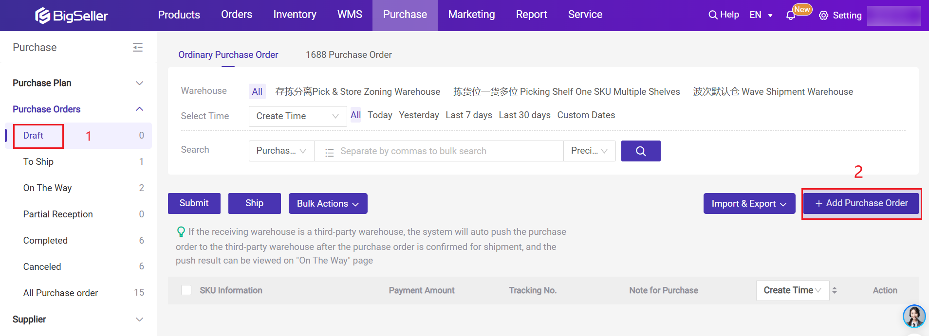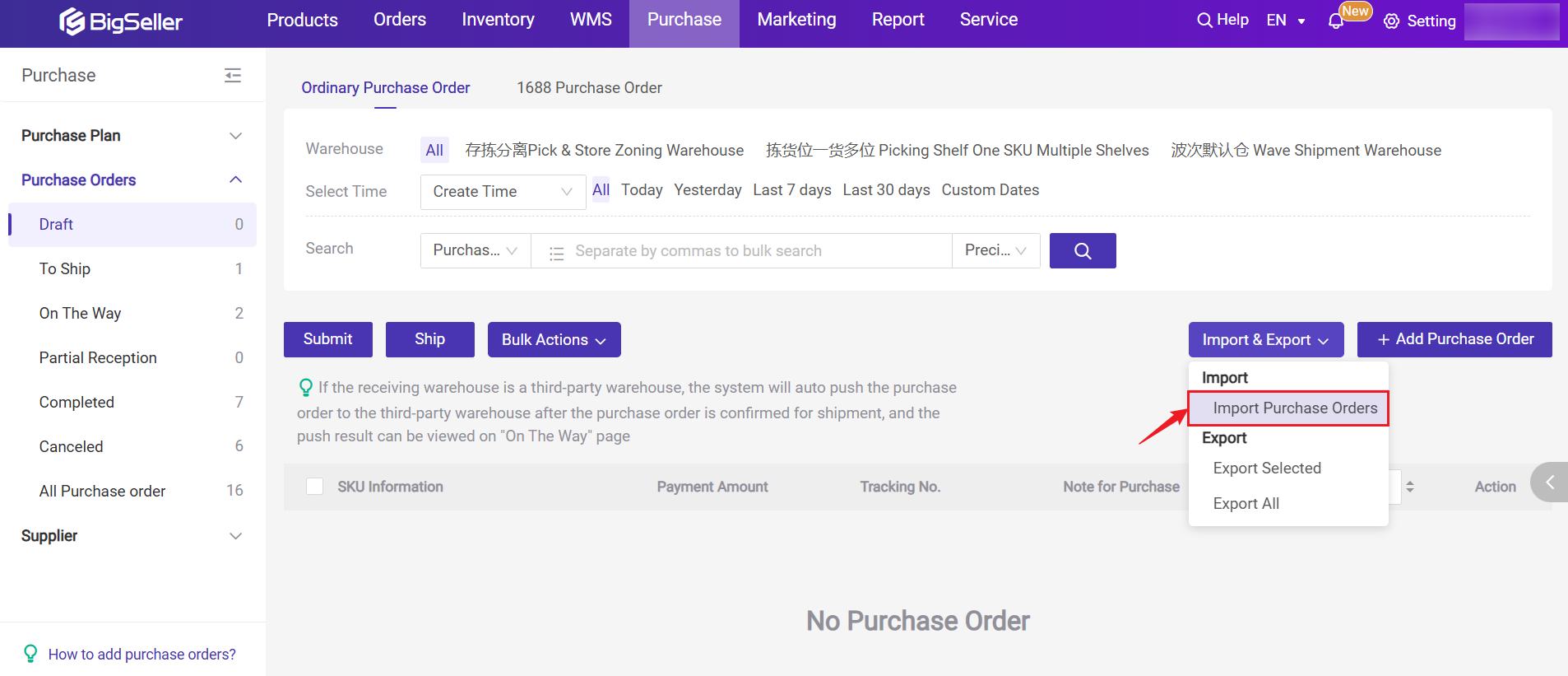 You can create a purchase order through the following two ways: single add, import to add.1.1 Add Single Purchase Order