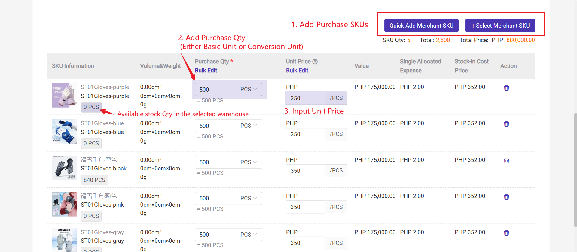 Step 3: Select or input the merchant SKUs you want to purchase.