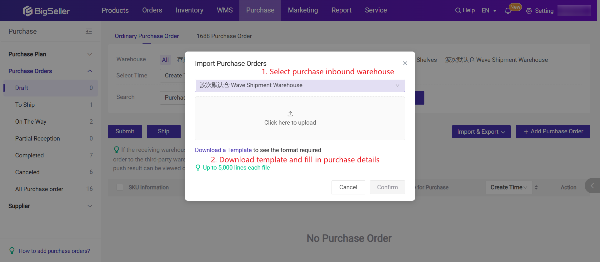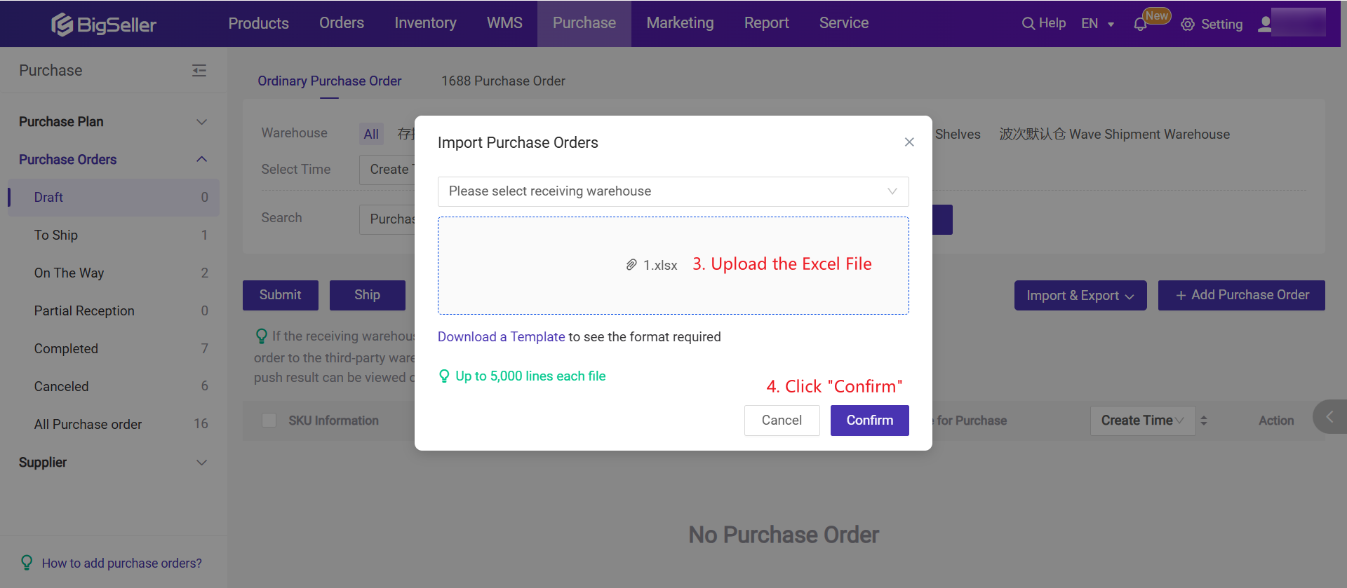 Step 2: download the template and fill in information > select the receiving warehouse > upload the file > click Confirm