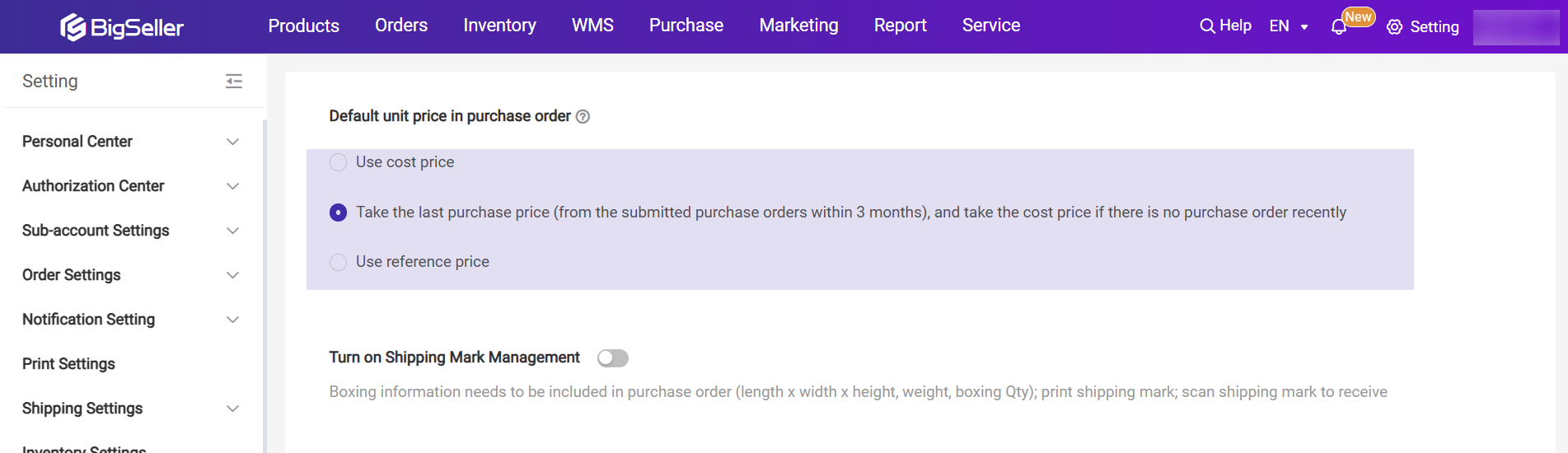 If the purchase price of your goods is relatively fixed, you don’t need to manually enter the unit price each time you create a purchase order. You can go to the purchase settings and set the logic for how the unit price is determined (as shown in the figure below).