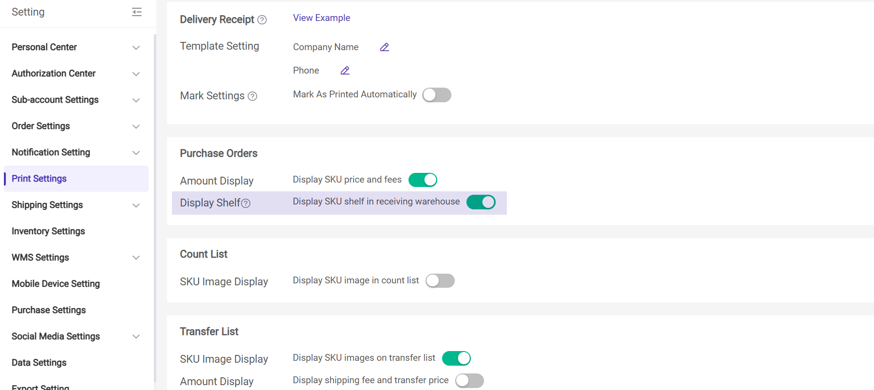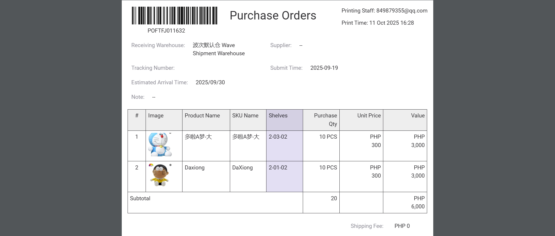 If you choose to display shelf, the shelf location of SKU in receving warehouse will be displayed in purchase order