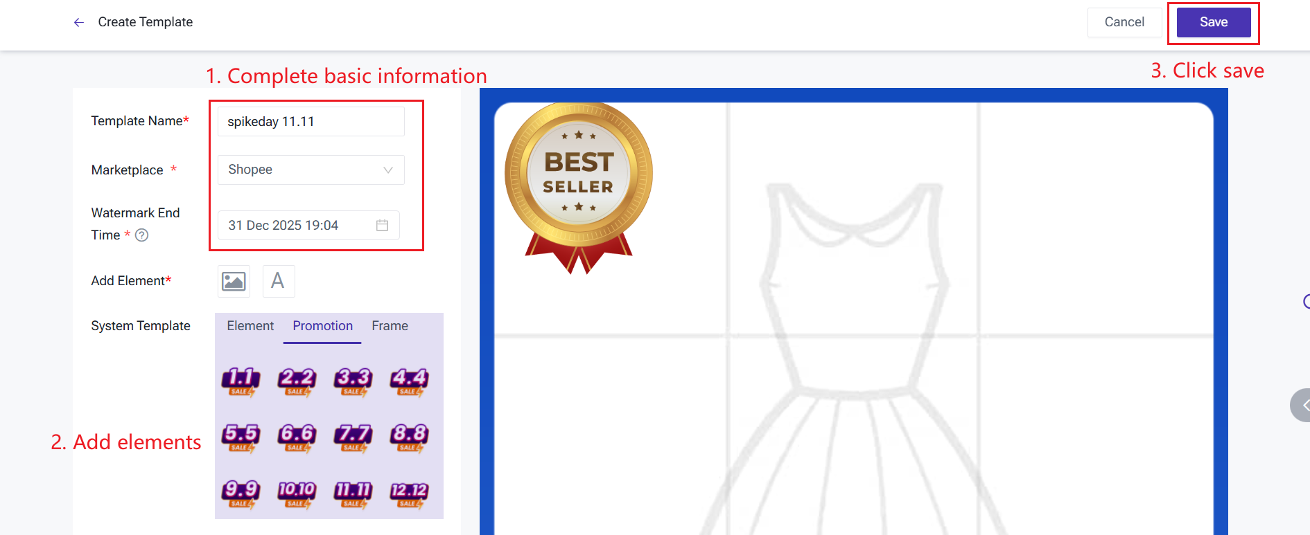 Step 3: Complete template information. You can either select from existing system materials or upload your own when filling in the promotion watermark template. Once the template is set up, please click "Save" to save tempalte information.