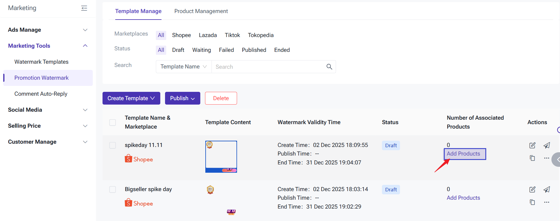 Step 4: Add Products. After clicking Add Products, the system will redirect you to the product selection page. Here, you’ll need to choose which store product you want to apply the promotion watermark template to.