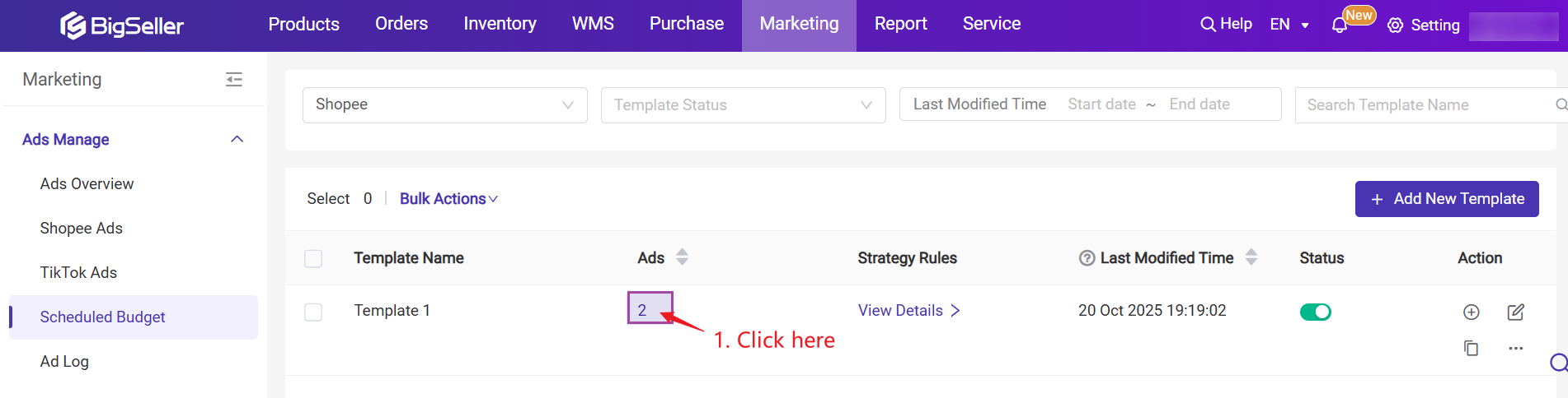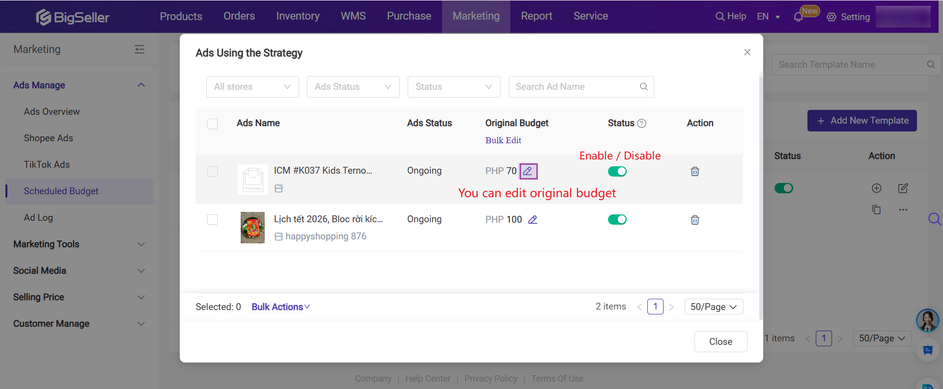 - Click here to see all ads associated with this budget template. In the pop-up window, you can edit the original budget, delete ads, enable or disable ads.