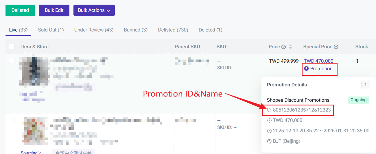 The details of the promotion ID and name will display when clicking Promotion (This applies for Shopee Only)