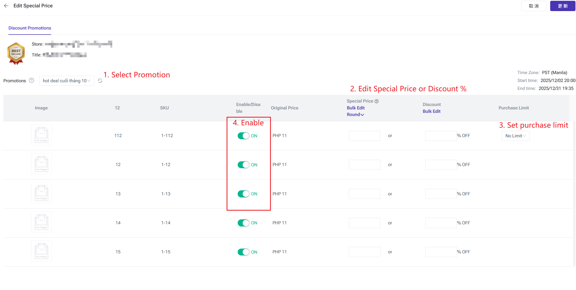 Step 2: Select a promotion, then set Discount Price/Discount and Purchase Limit.
