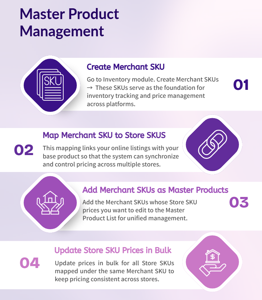 With Master Product Management, you can add merchant SKUs as master products and bulk adjust the prices and promotional prices of online products (store SKUs) in bulk based on SKU mapping relations. The Master Product serves as a central product record that links all related products (Store SKUs) from different platforms or stores (e.g., Shopee, Lazada, TikTok).