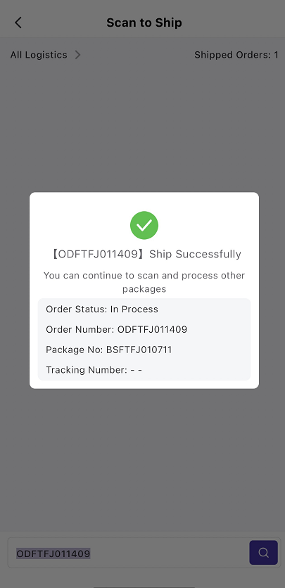Tip: Only orders in [In Process Orders] list can be scanned to ship. After scanning successfully, the package would auto move to [To Pickup Orders] list.