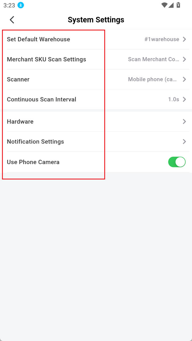 Setting: It supports to select default warehouse, Merchant SKU Scan Setting, Scanner etc.