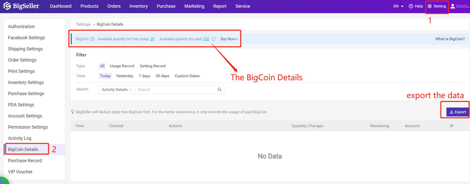 On the settings page, BigSeller will record the gain and usage history of BigCoin in your account.