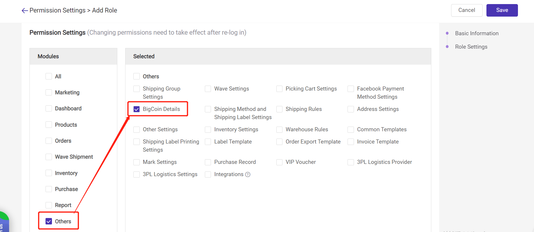 Steps: Setting > Permission Settings > Roles > Add/Edit Roles > Others > BigCoin Details