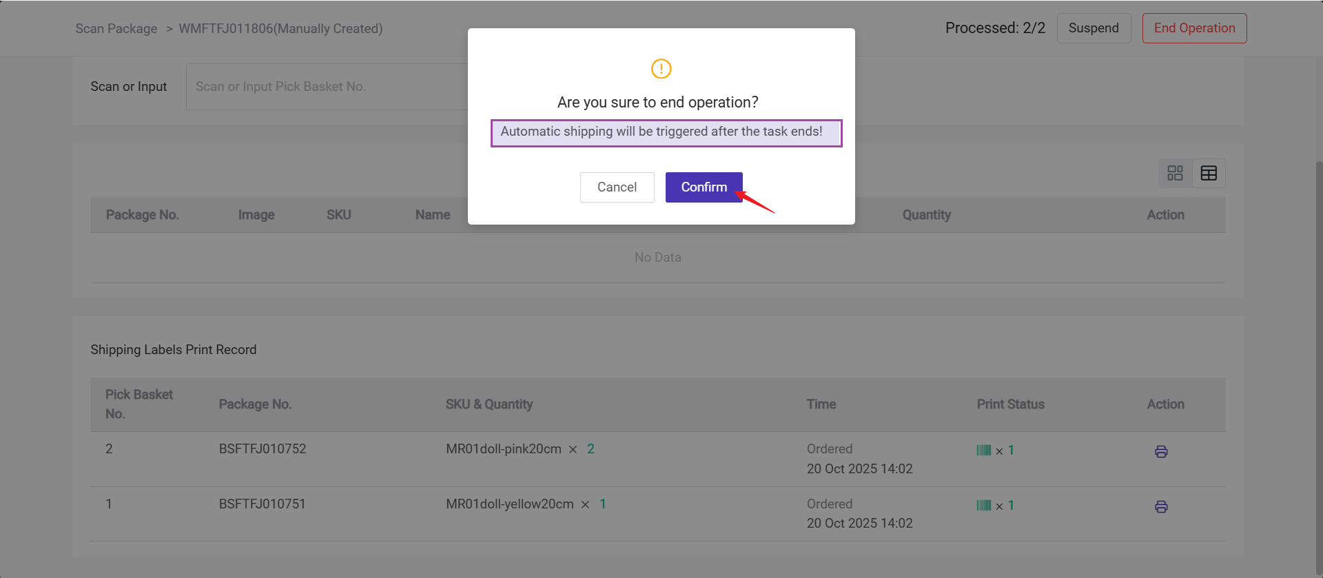 Step 3: Repeat the process untill all picking basket number has been scaned and all shipping labels have been printed >> Click End Operation
