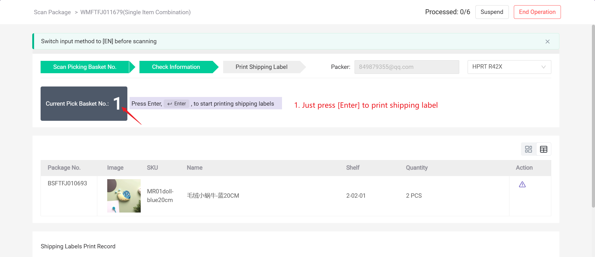 This process doesn't require scanning basket number. The system will auto-match baskets (1→2→3). Just confirm the package and press Enter to print the shipping label. Once printed successfully, the next basket will appear automatically. When all packages are printed successfully, the system will prompt “Packaging Complete.”
