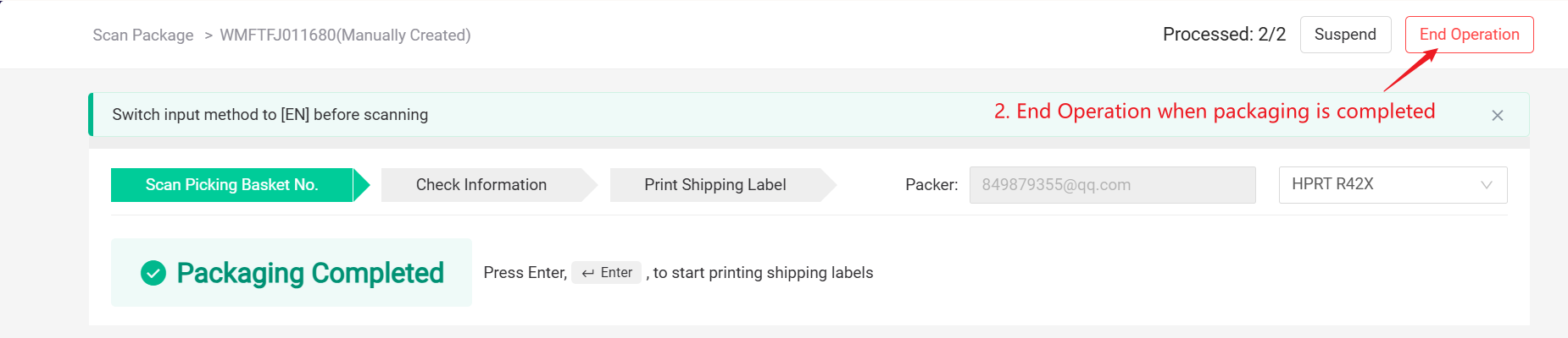 Step 2: After all packages' shipping labels have been successfully printed, you can end the operation.