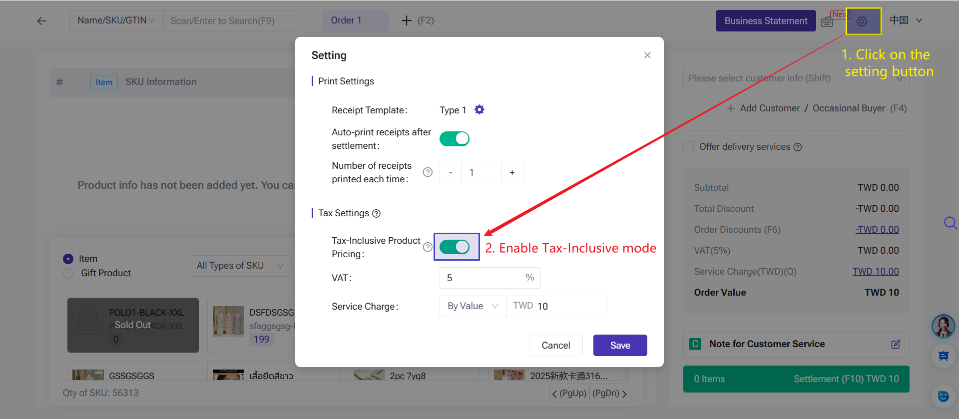2. If you enable the [receipt auto print], the receipt will be auto printed after clicking settlement.