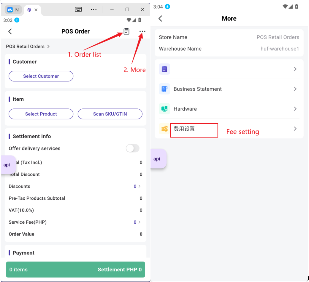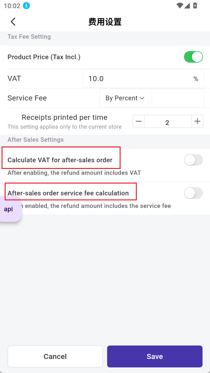Setting: POS Orders > Click More > Fee Settings: Two new configuration options have been added: Calculate VAT for after-sales order and After-sales orders service fee calculation