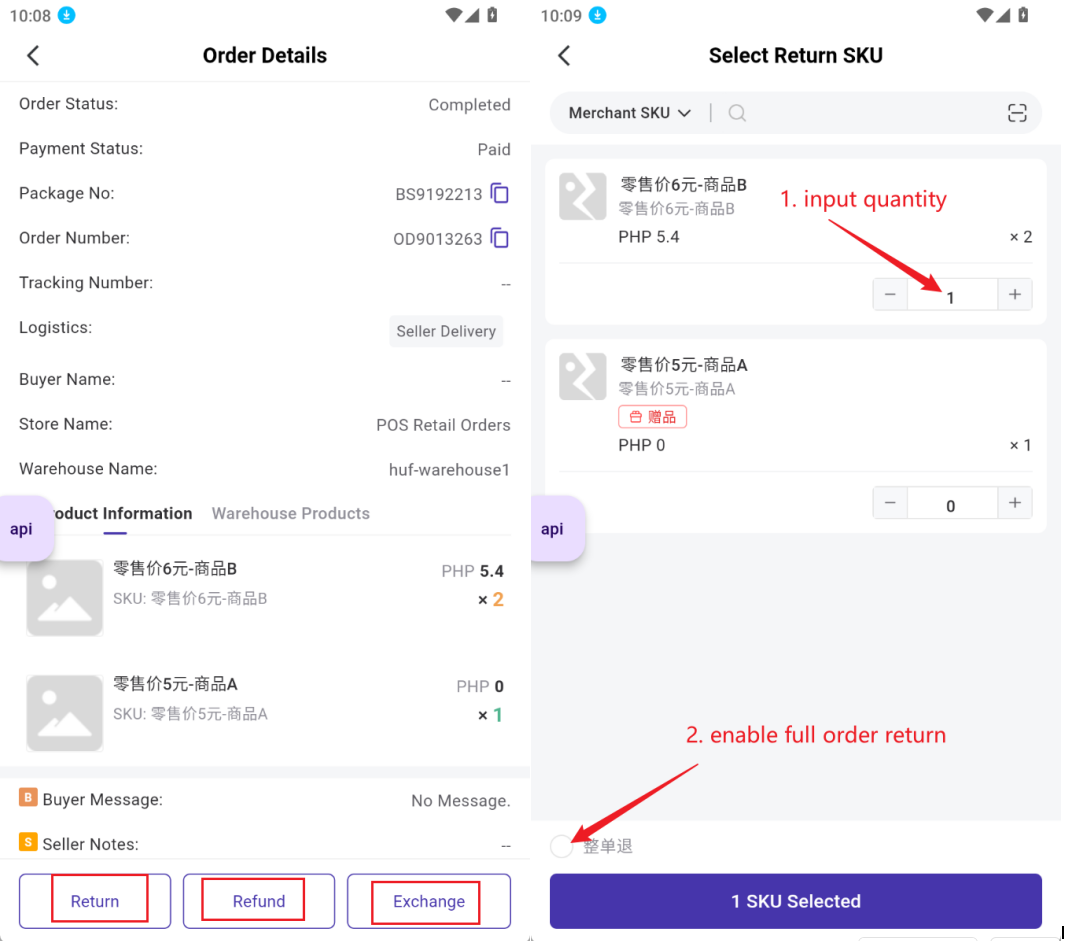 a. Select return items and input quantity, or enable full order return.