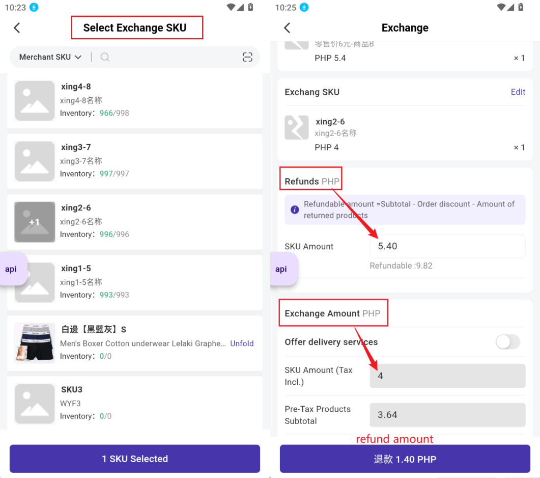 - If the return item amount is greater than the exchange item amount, the button will show Refund, click to choose the refund method.
