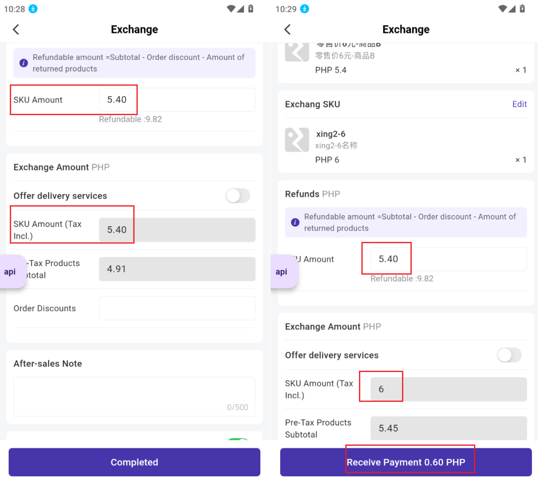 - If the return item amount equals the exchange item amount, the button will show Complete, click to finalize the after-sales process.