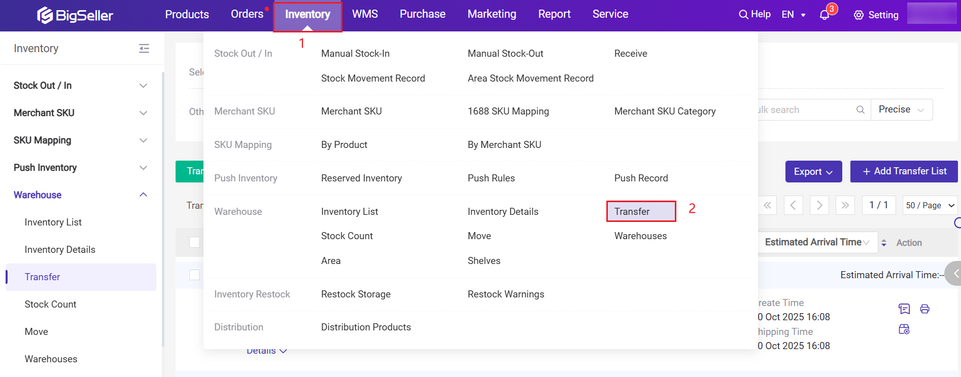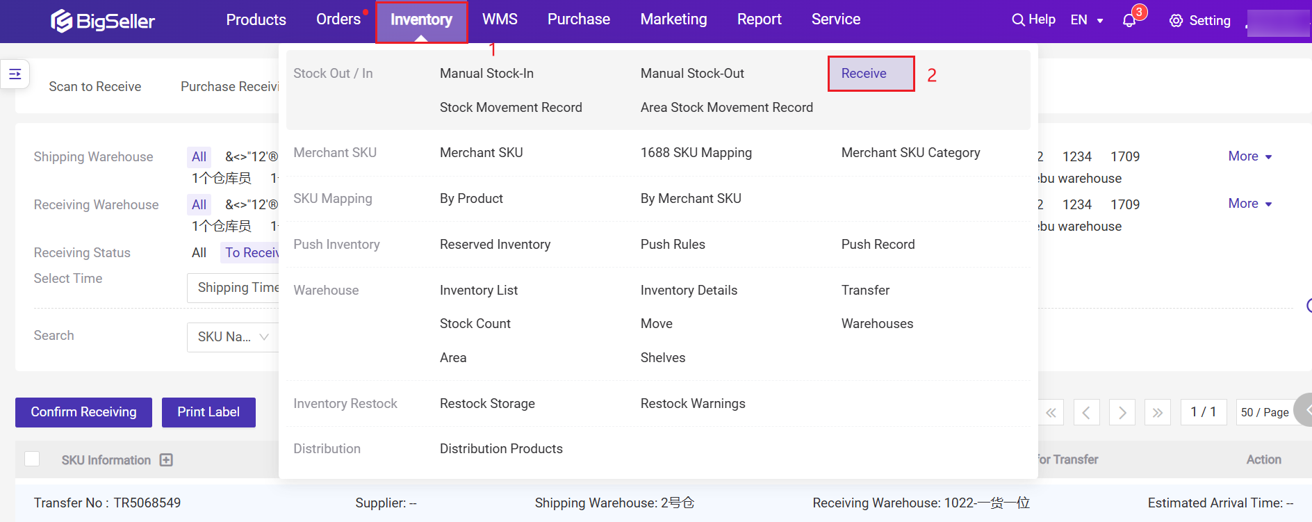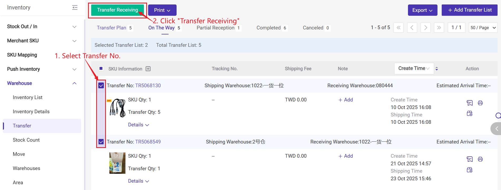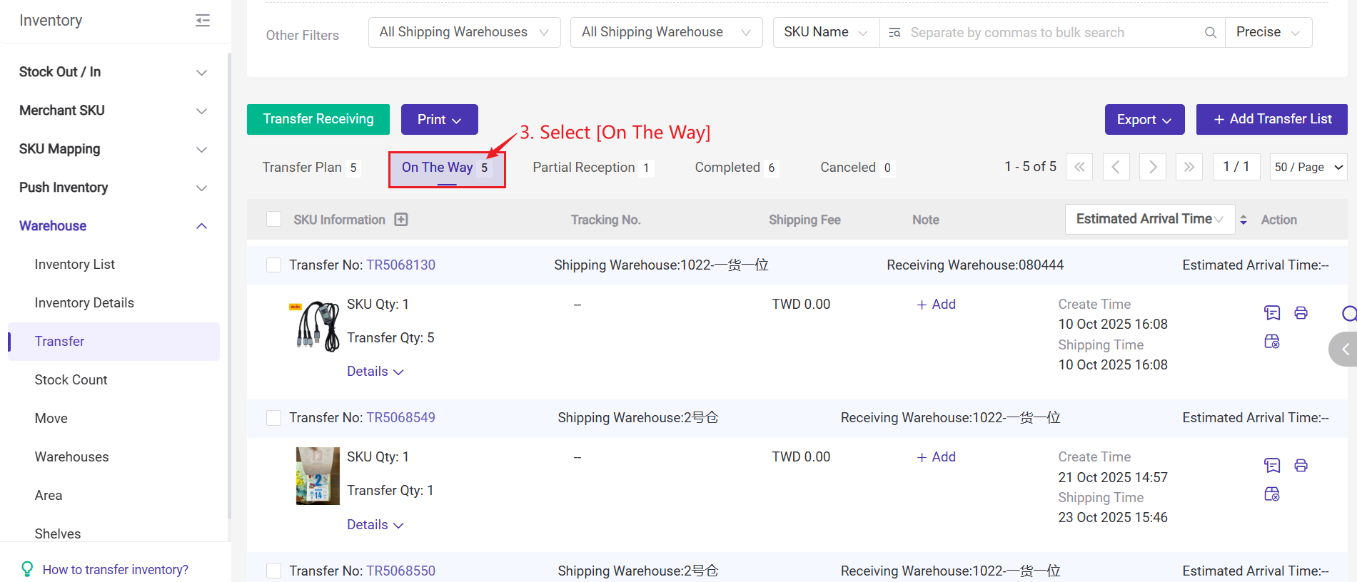 Step 1: Go to the Transfer Receiving page: Receive > Transfer Receiving or Transfer > On the Way.