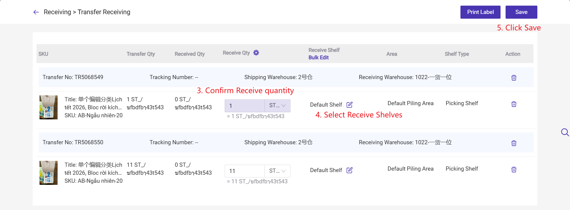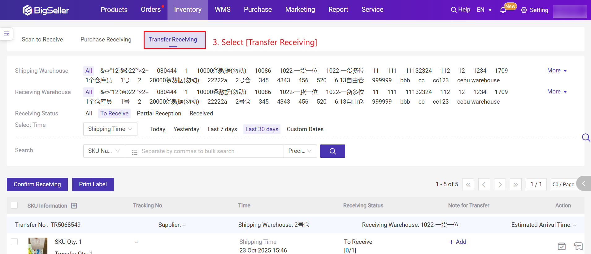 Step 2: Select the transfer orders you want to receive, and click Transfer Receiving.