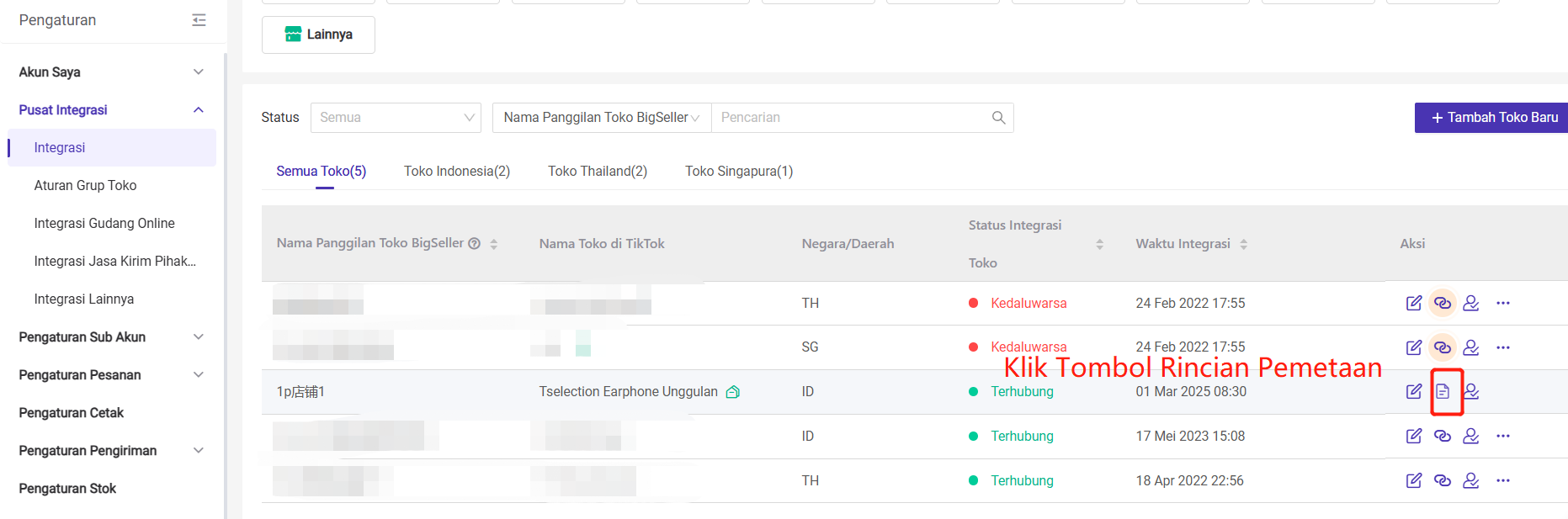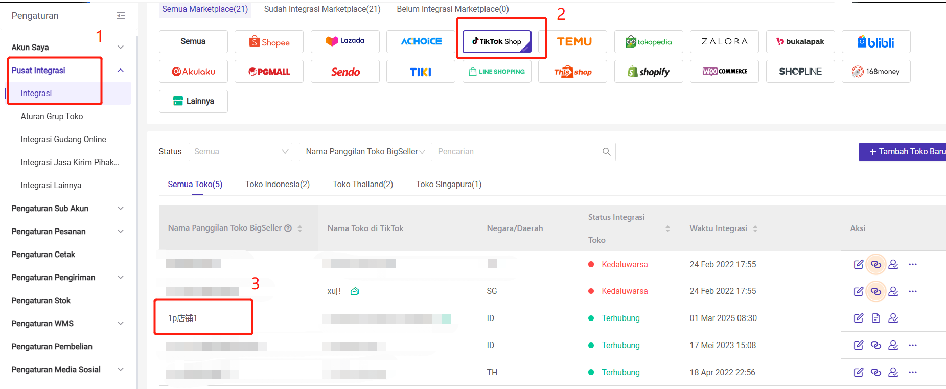 Masuk ke Pengaturan > Pusat Integrasi > Integrasi > Pilih Marketplace TikTok > Lihat Toko Semi-Managed