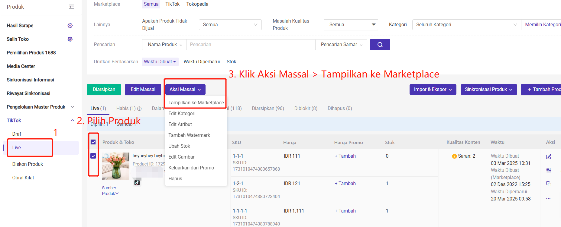 Produk > Produk Live > Pilih Produk > Klik Aksi Massal > Tampilkan ke Marketplace