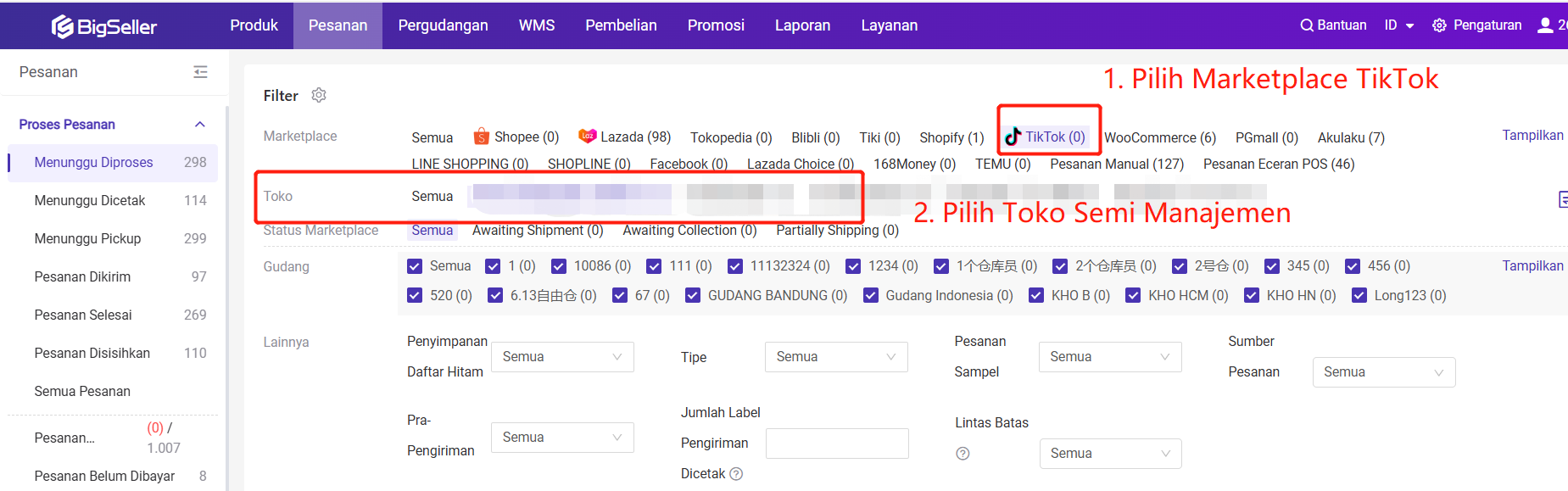 Anda dapat memfilter pesanan dari toko semi manajemen TikTok dan proses pesanan.