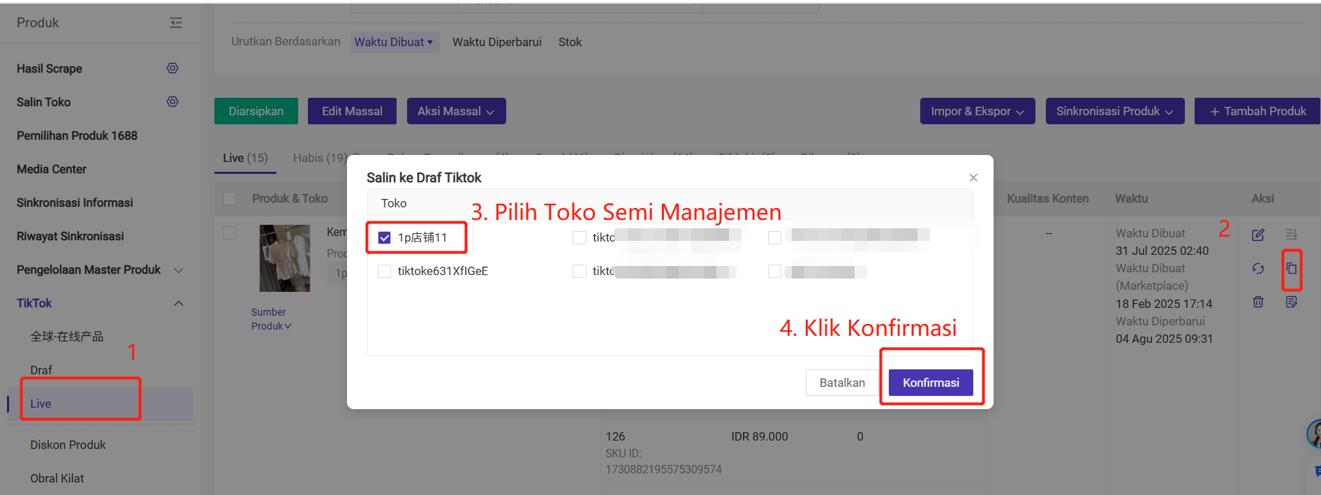 Hanya produk yang berada dalam daftar "Produk Live" toko lokal yang dapat ditampilkan ke toko Semi Manajemen. Produk dalam draf dapat ditampilkan ke toko Semi Manajemen,Anda dapat menggunkan fitur salin toko atau fitur salin ke darf tiktok dari status live produk TikTok, tetapi produk nya dapat disalin harus dari toko semi manajemen, caranya seperti berikuti: