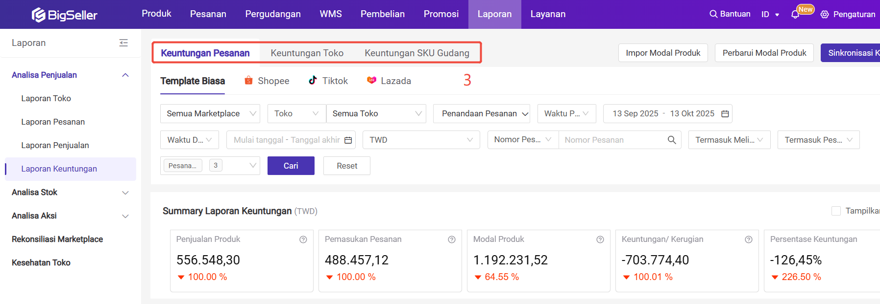 Anda dapat Pilih Halaman Keuntungan Pesanan, Keuntungan Toko atau Keuntungan SKU Gudang.