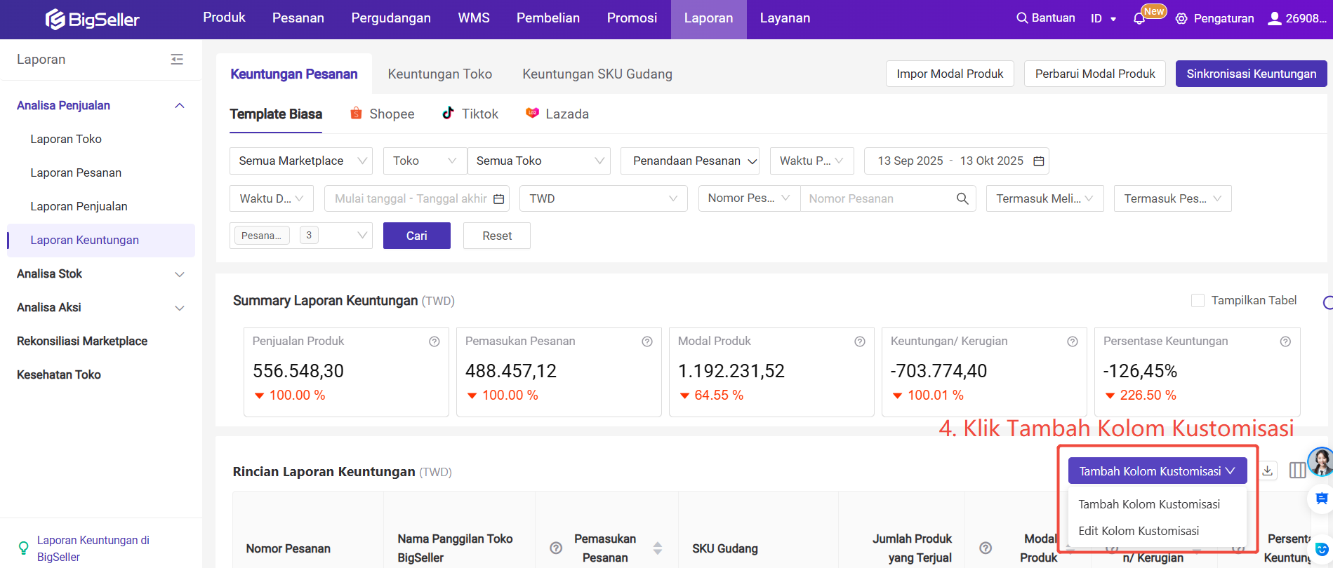 Cara Tambah Kolom Kustomisasi di Halaman Laporan Keuntungan