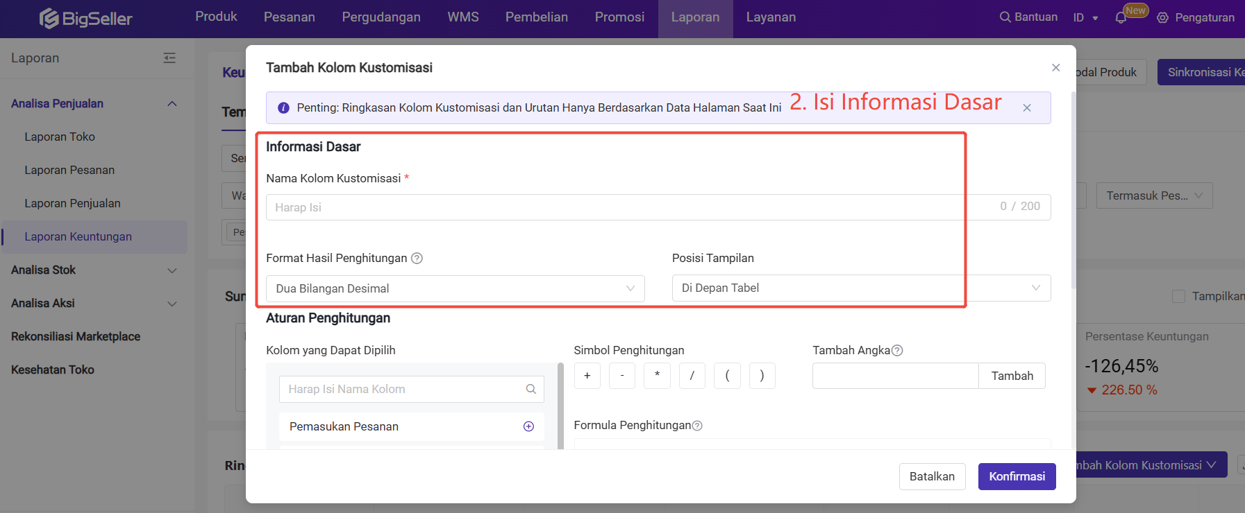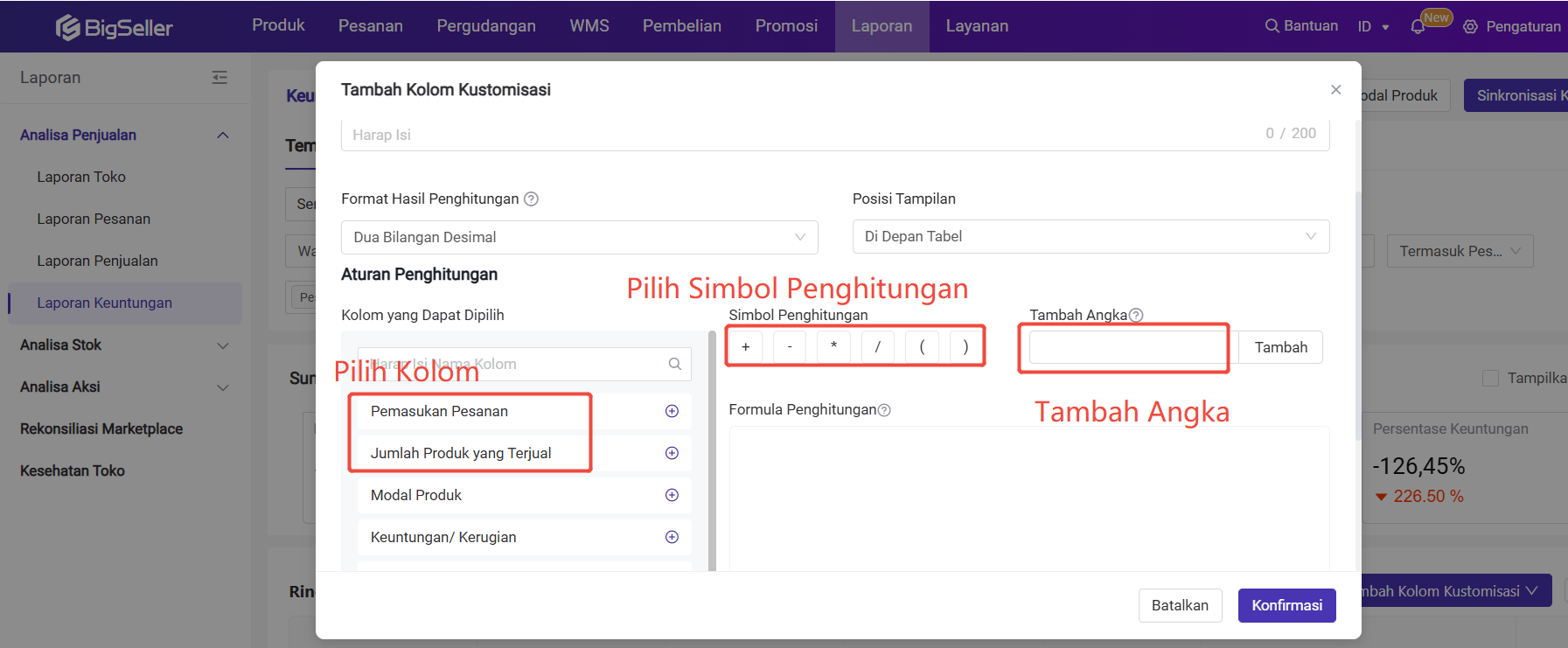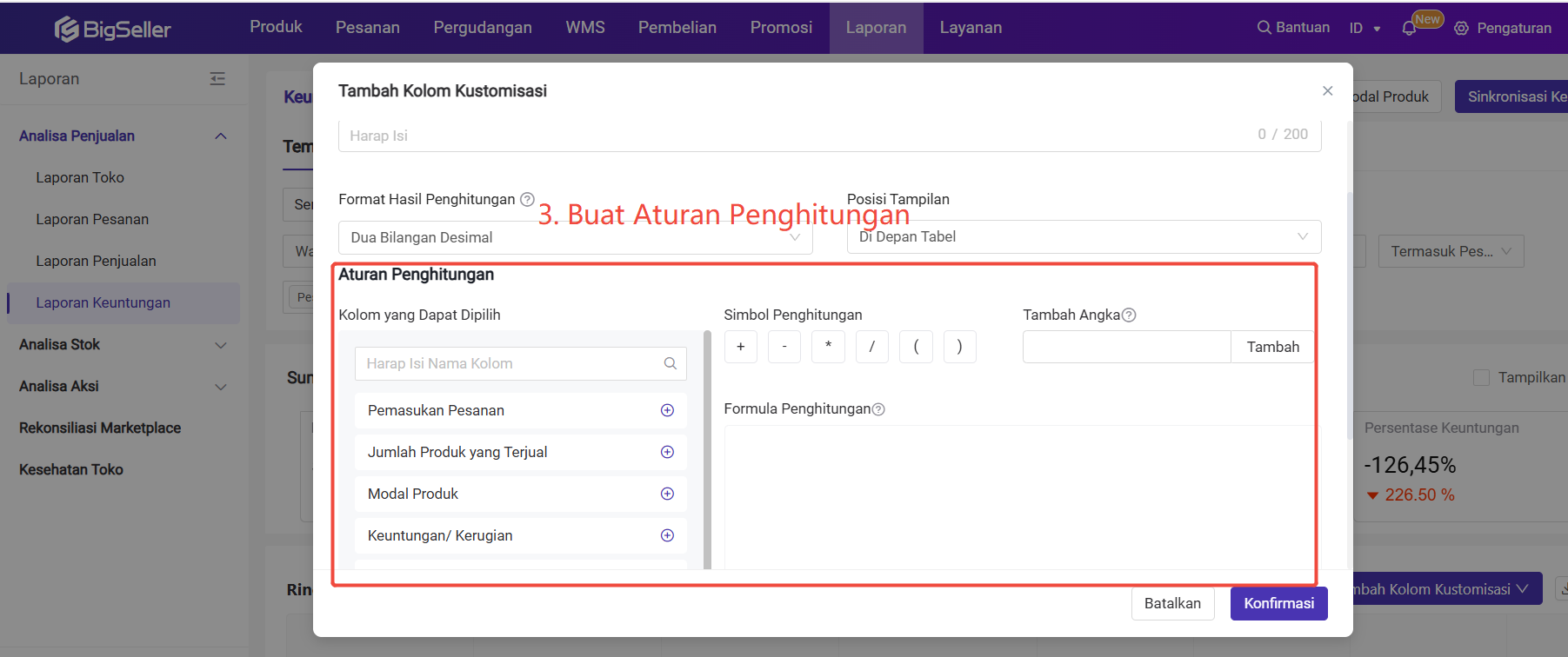 Anda dapat tambah kolom kustomisasi untuk membuat aturan penghitungan yang diinginkan di halaman laporan keuntungan.