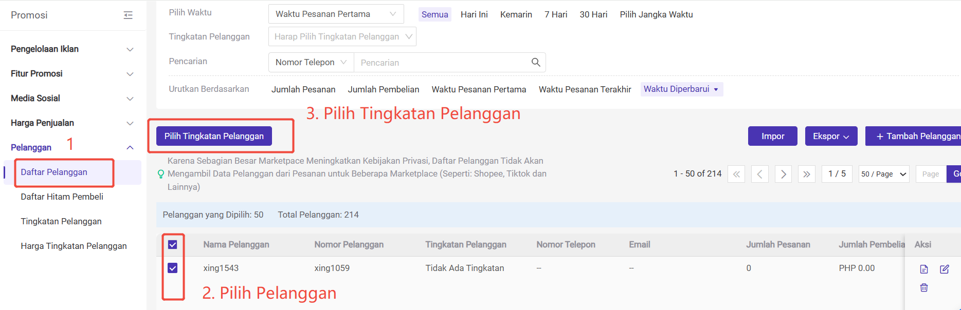 Tambahkan fitur Tingkatan Pelanggan, memudahkan untuk mengelola informasi pelanggan dari pesanan dari Toko Di Luar Marketplace, memenuhi kebutuhan Anda, dan meningkatkan pengalaman layanan.