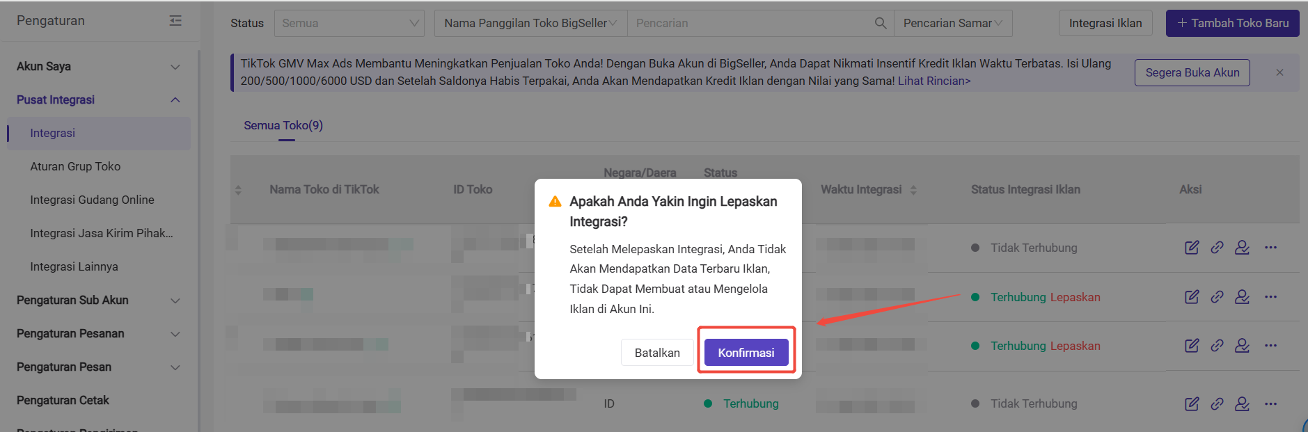 Masuk ke halaman integrasi toko > Klik tombol " Lepaskan" > Klik Konfirmasi