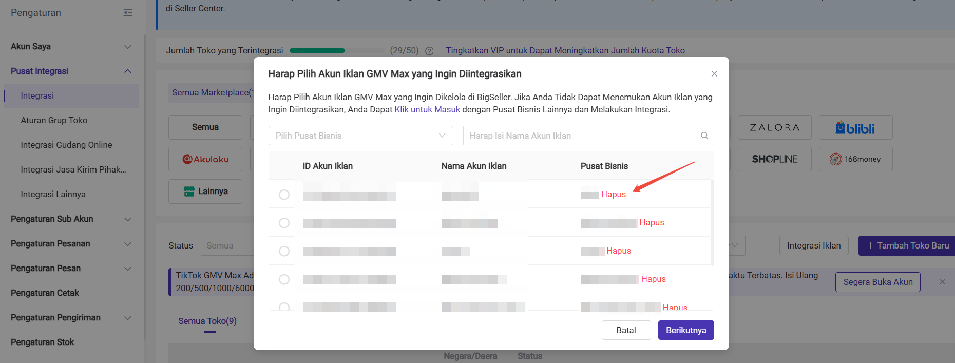 • Pilih Akun Iklan GMV Max yang Ingin Diintegrasikan