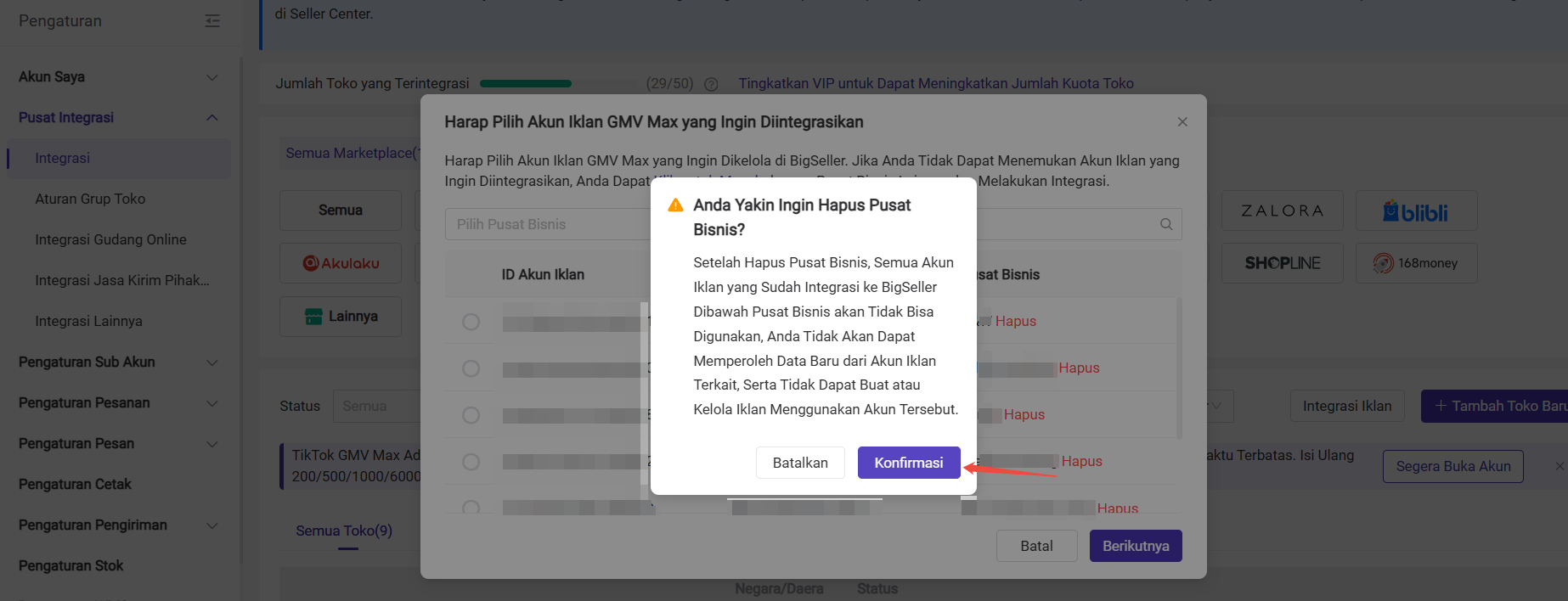 Catatan: Setelah Hapus Pusat Bisnis, Semua Akun Iklan yang Sudah Integrasi ke BigSeller Dibawah Pusat Bisnis akan Tidak Bisa Digunakan, Anda Tidak Akan Dapat Memperoleh Data Baru dari Akun Iklan Terkait, Serta Tidak Dapat Buat atau Kelola Iklan Menggunakan Akun Tersebut.