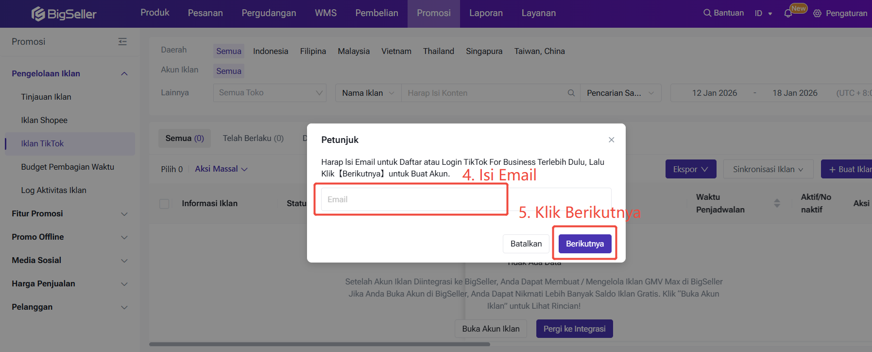 Masuk ke halaman Modul Promosi > Klik Iklan TikTok > Klik Buka Akun Iklan > Isi email > klik Berikutnya > kemudian pergi ke TikTok untuk buka akun iklan