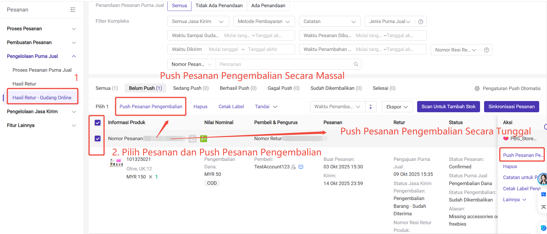 A1: Anda bisa masuk ke kolom "Berhasil Push", kemudian tekan aksi Kembalikan pesanan pengembalian