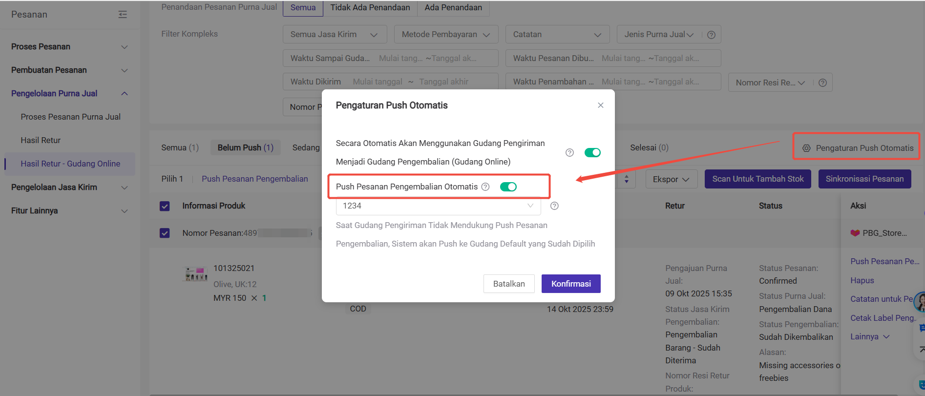 Anda juga bisa mengaktifkan fitur Push Pesanan Pengembalian Otomatis, setelah mengaktifkan fitur nya, sistem akan secara otomatis push pesanan pengembalian dengan status belum push ke gudang online.