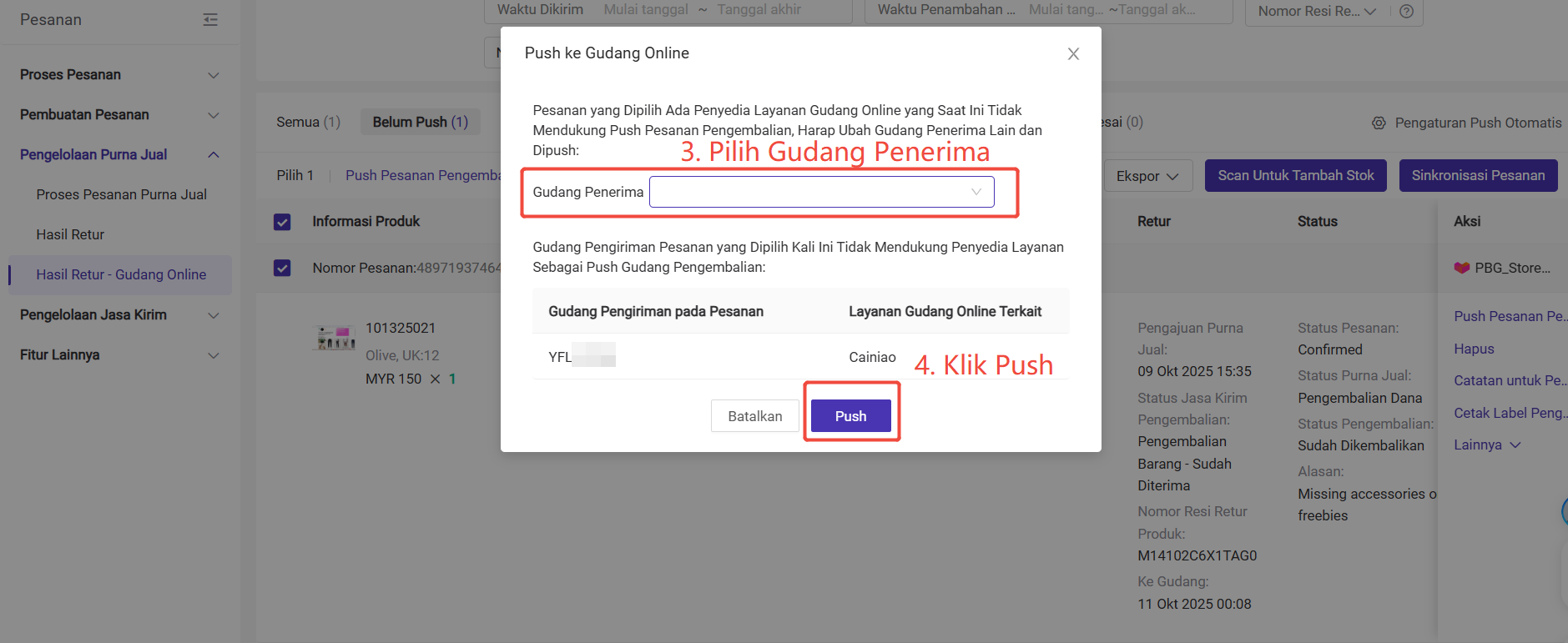 Push Dikembalikan: Pesanan yang di push ke gudang online dikembalikan
