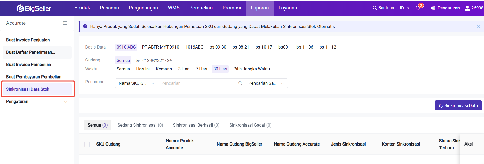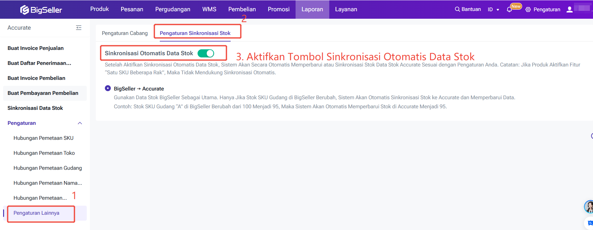 Jika ingin sistem otomatis memperbarui stok di accurate saat ada perubahan stok SKU Gudang di BigSeller, Anda dapat mengaktifkan fitur Sinkronisasi Otomatis Data Stok.