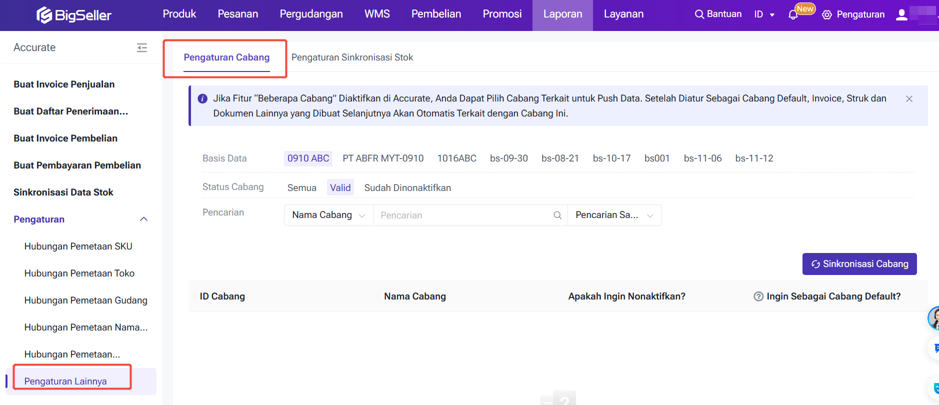 Memilih Cabang Tertentu Secara Tunggal Saat Push Invoice Penjualan, Daftar Penerimaan Penjualan, Invoice Pembelian dan Pembayaran Pembelian ke Accurate.