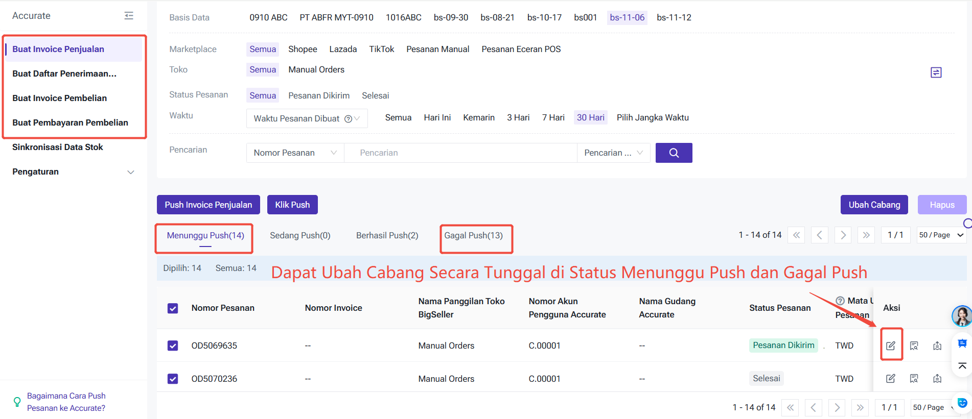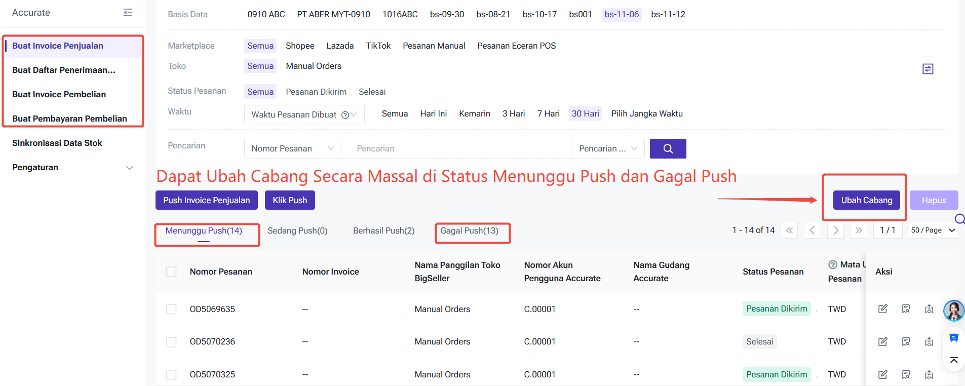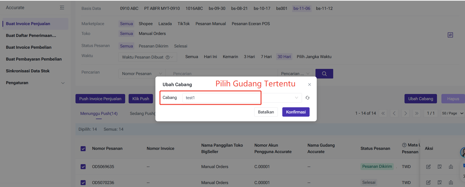 Memilih Cabang Tertentu Secara Massal Saat Push Invoice Penjualan, Daftar Penerimaan Penjualan, Invoice Pembelian dan Pembayaran Pembelian ke Accurate.